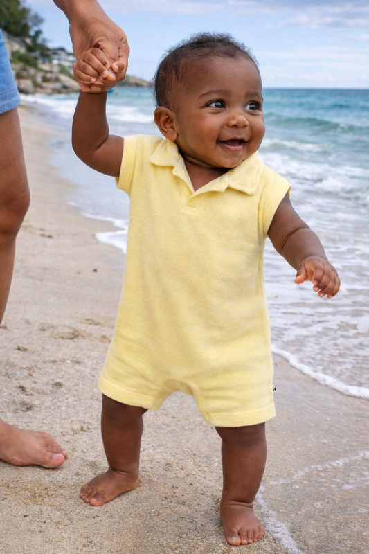 1+ in the family soft terry romper in a lemon yellow shade, perfect for warm weather play. features short sleeves, a classic collar, and convenient snap closures between the legs for easy diaper changes.