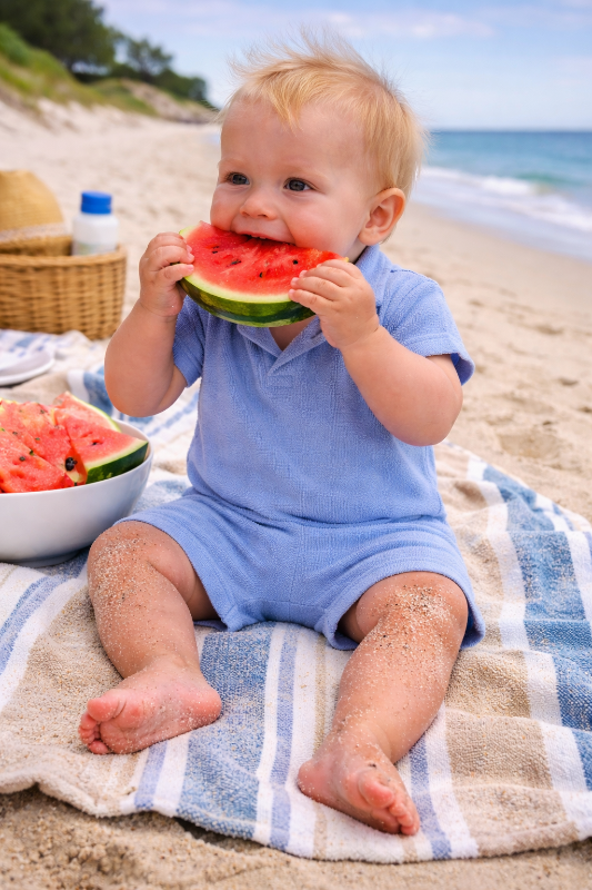 1+ in the family soft terry romper in marine blue, perfect for warm weather play. features short sleeves, a classic collar, and convenient snap closures between the legs for easy diaper changes.