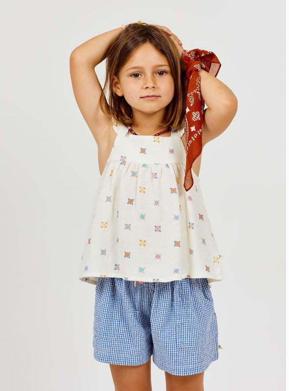 arsene & les pipelettes vichy shorts in a classic gingham seersucker fabric with a rich cobalt blue tone. the fully elasticated waist with decorative drawstring ensures a comfortable fit, while dual side patch pockets offer practical storage. a signature flag label at the side seam adds a refined finishing touch.