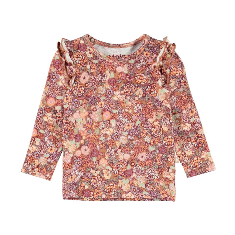 molo emma baby top with ruffles and floral print. it has long sleeves with ruffles at the armholes and snaps on one shoulder.