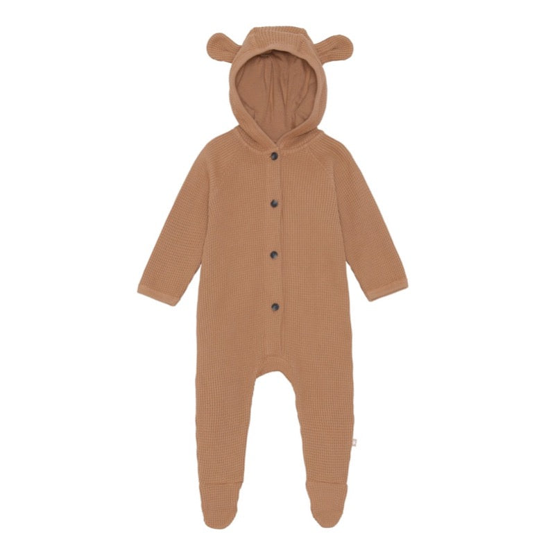 molo faith is a rose mist colored, waffle knit baby romper with a snap closure on the front and a hood with small, sewn on ears. please note that the romper has feet for sizes up to 9m, while size 12m does not.