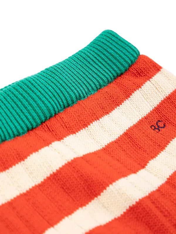 adorable bobo choses striped culottes crafted from soft organic cotton with a fine knit construction. featuring bold red and off-white stripes throughout, these playful pants are finished with cozy ribbed leg openings and waistband in contrasting green.
