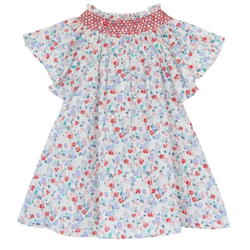this bonton baby dress features a floral print in red and blue tones set against a cream background. the a-line silhouette provides comfortable movement, while flutter sleeves add a playful touch. a red smocked neckline creates gentle gathering at the collar, and decorative bonton embroidery in red adorns the hem for extra character. functional chest buttons complete the design, making dressing easy while keeping the look effortlessly sweet.