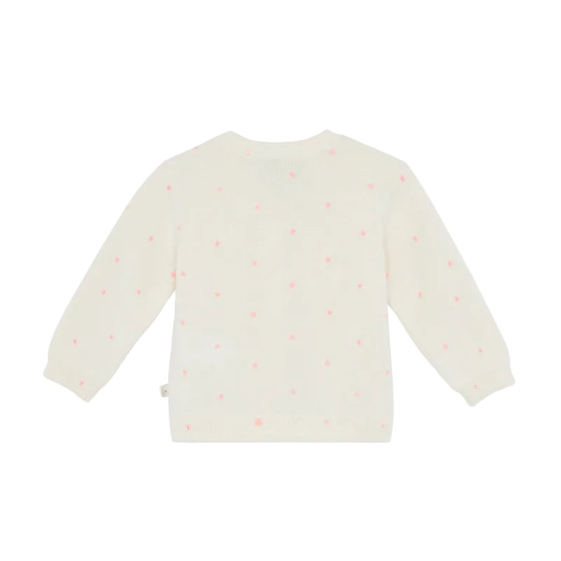 bonton cardigan crafted from fine knit cotton with charming intarsia pink stars scattered throughout. features a classic round neckline and ribbed trims for a polished finish. perfect for layering over your little one's favorite outfits, this piece combines comfort with playful style.