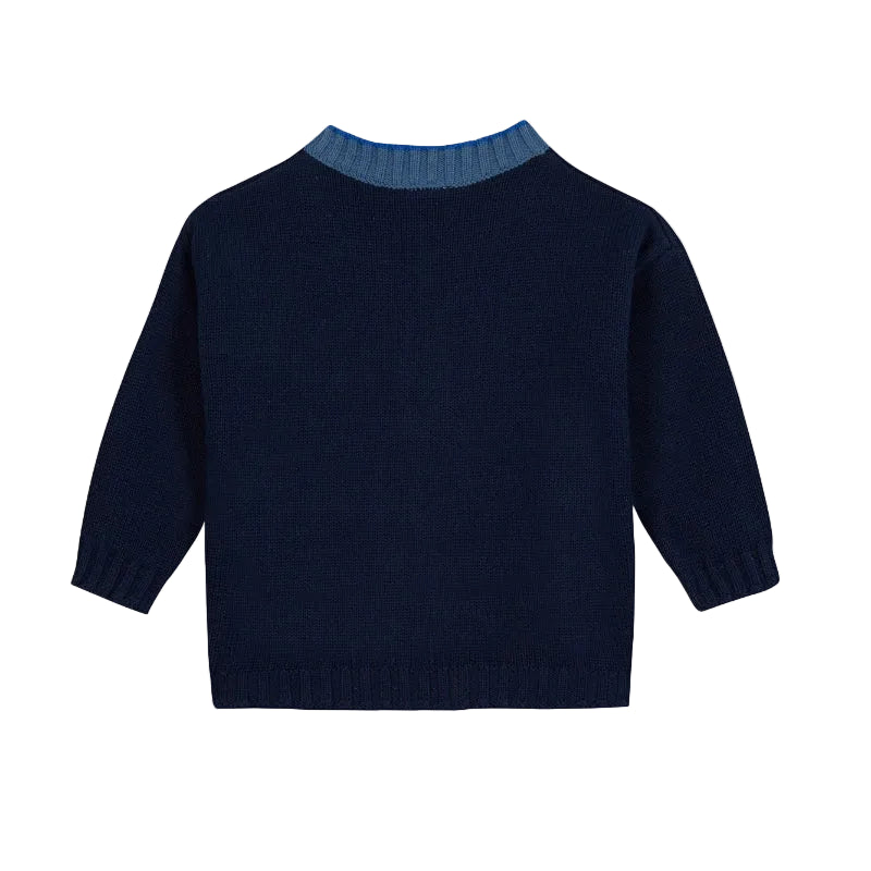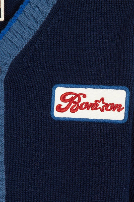 bonton navy blue cotton knit cardigan crafted from soft cotton. finished with ribbed detailing throughout, it features a classic v-neck with button placket ribbing in a contrasting light blue shade. the signature bonton patch on the chest adds a playful touch of character.