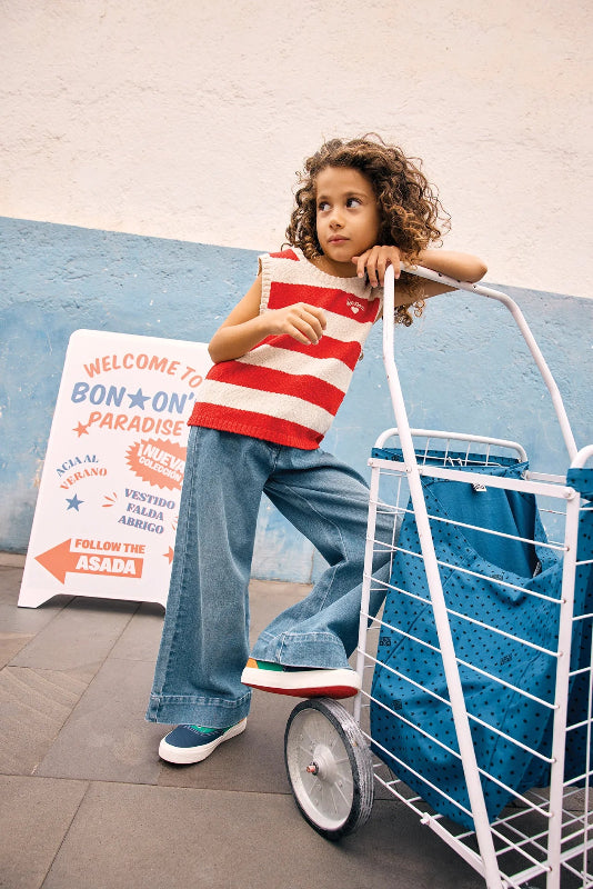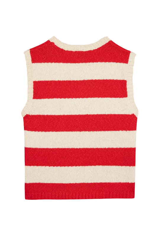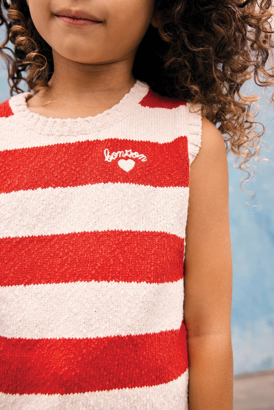 bonton soft knit cotton tank top in classic red and beige stripes. features a bonton embroidery on the chest and a comfortable round neckline finished with ribbed edges for a polished look.