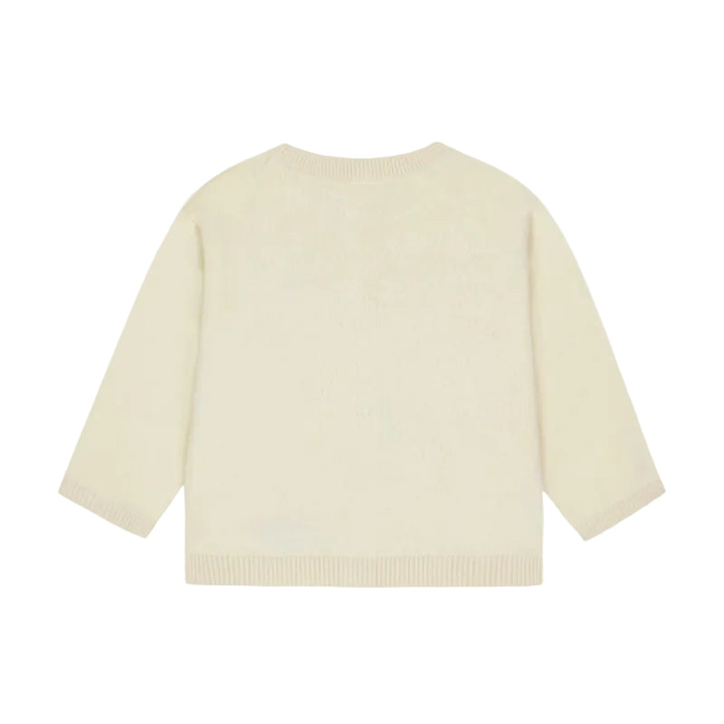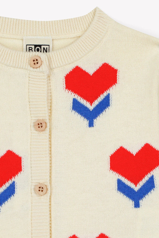 bonton ecru cotton cardigan featuring a charming intarsia knit heart-shaped flowers in red and blue on the front. crafted from fine knit fabric with ribbed trims for a polished finish. perfect for layering over your little one's favorite outfits, this piece combines comfort with sweet style details that make getting dressed fun.