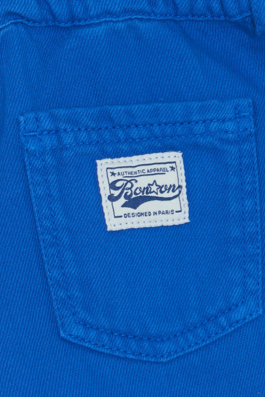 bonton royal blue cotton shorts crafted with a relaxed paper bag silhouette. they feature a defined waistband with belt loops for easy styling. front pockets keep essentials within reach, while back pockets—including one adorned with a signature bonton patch—add character. the raw hemline gives them a laid-back vibe perfect for warm-weather days.