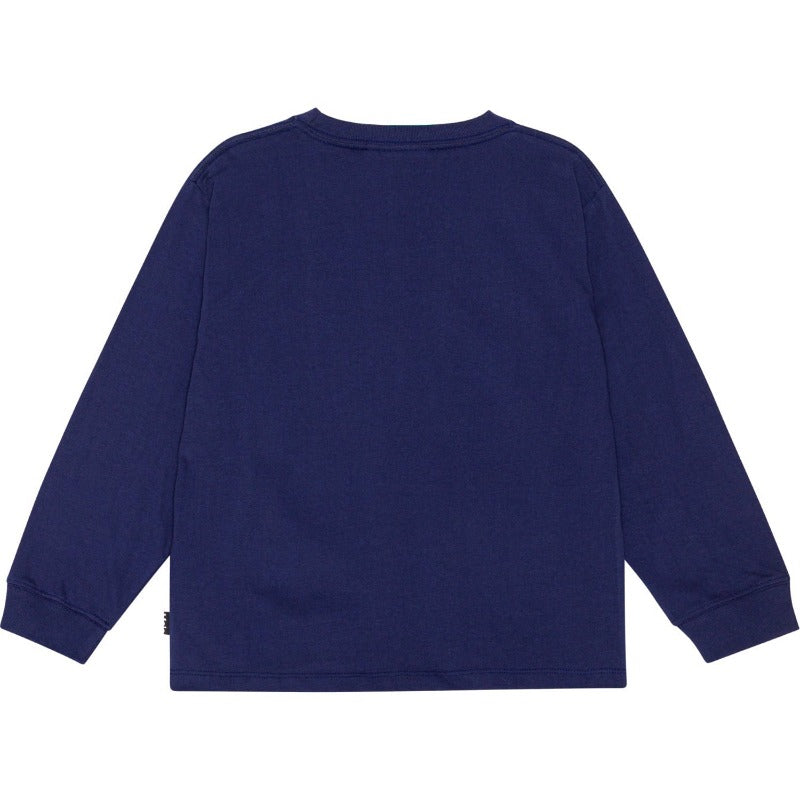 molo rube long sleeve top in navy blue with a flying saucers graphic on front.