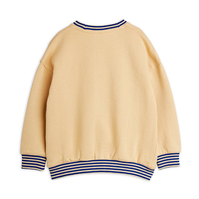 mini rodini organic cotton sweatshirt featuring a playful chenille soccer ball on the front. the beige base pairs perfectly with ribbed edges trimmed in dark blue stripes for a sporty-casual vibe. soft, breathable, and made from sustainable materials—perfect for everyday wear that feels as good as it looks.