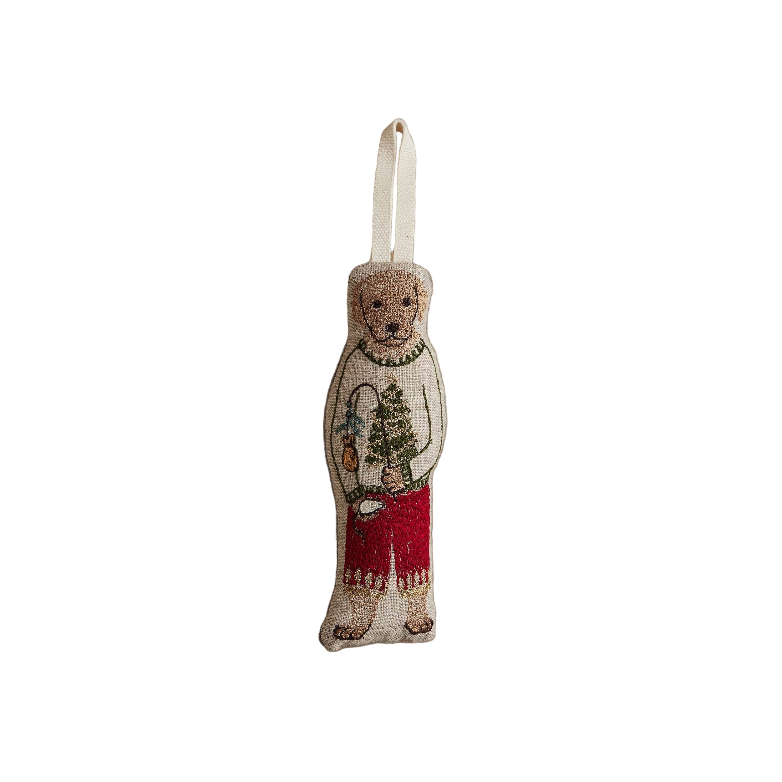 dog tree ornment wearing a holiday ensemble, complete with a christmas tree sweater. dog is holding gifts for his feline friend, a white mouse and a cat toy!
