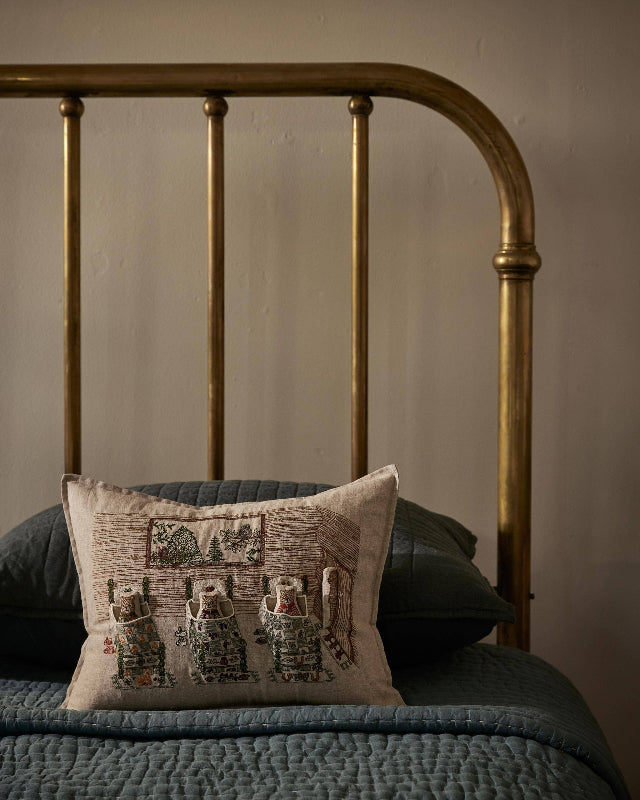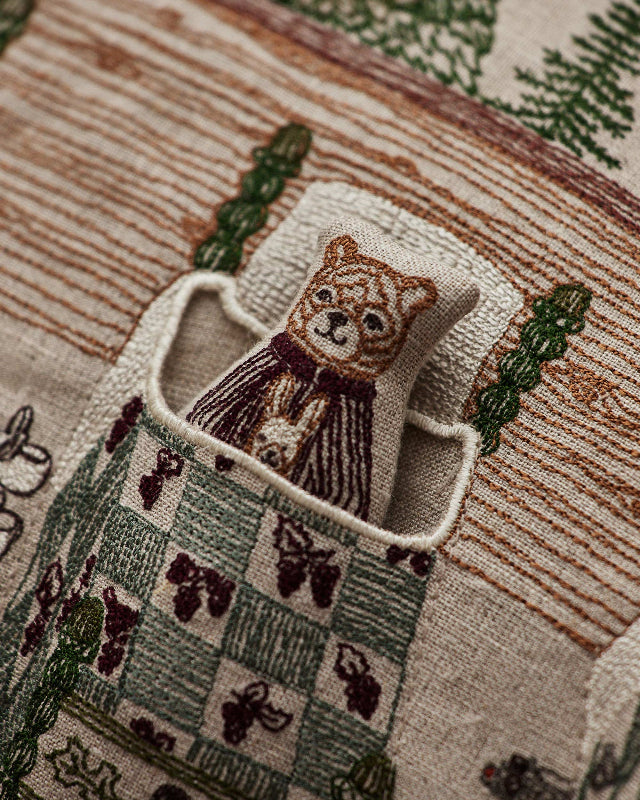 coral & tusk storybook pocket pillow brings the tale of “goldilocks and the three bears” to life! find three little bear pals tucked in their beds, remove them from their pockets to find each bear holding an animal doll. the fox, rabbit, and owl dolls coordinate with the slippers at the side of each bear’s bed. the beds are thoughtfully stitched with symbols of luck and nature. embroidery on natural linen.