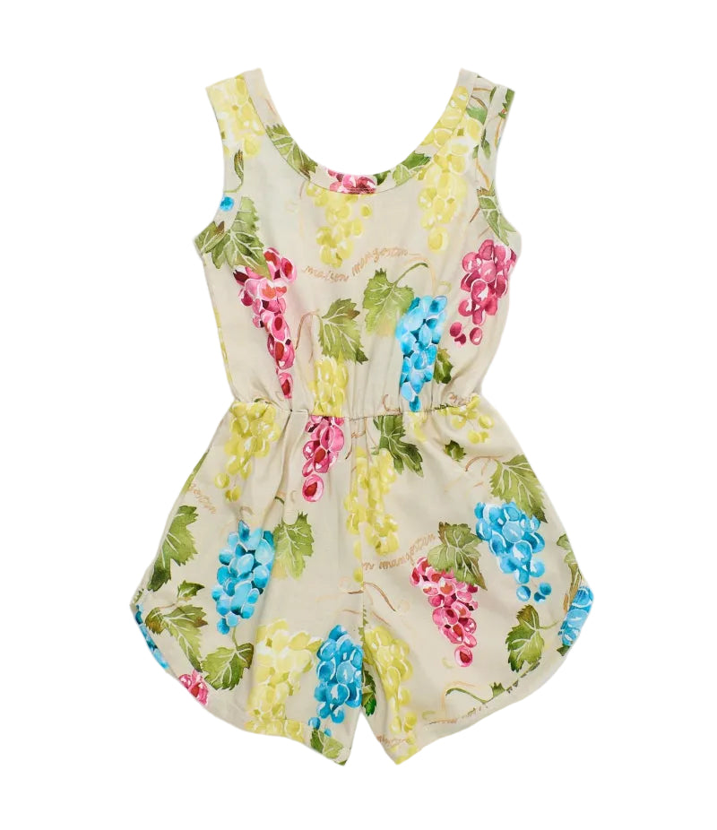 effortless and playful, this beige maison mangostan jumpsuit features an all-over watercolor grape vine print. crafted from 100% cotton for breathable comfort, it has a gathered elasticated waist for an easy fit, sleeveless tank-top design, and finished edges for a polished touch.