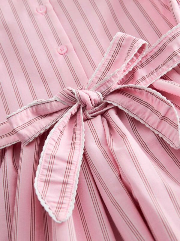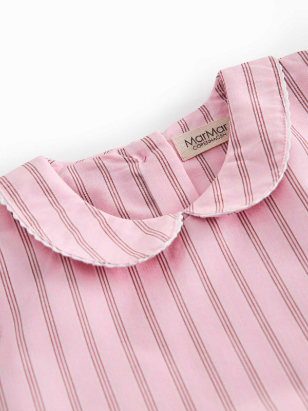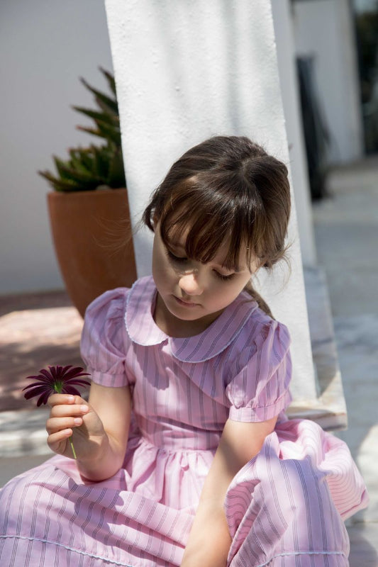 marmar copenhagen cotton dress in soft bonbon pink stripes with white trim details. features a classic peter pan collar, short puff sleeves, and a full skirt with adjustable tie-back detail. buttons close at the back for easy dressing. perfect for special occasions, this piece combines timeless style with comfortable 100% cotton construction.