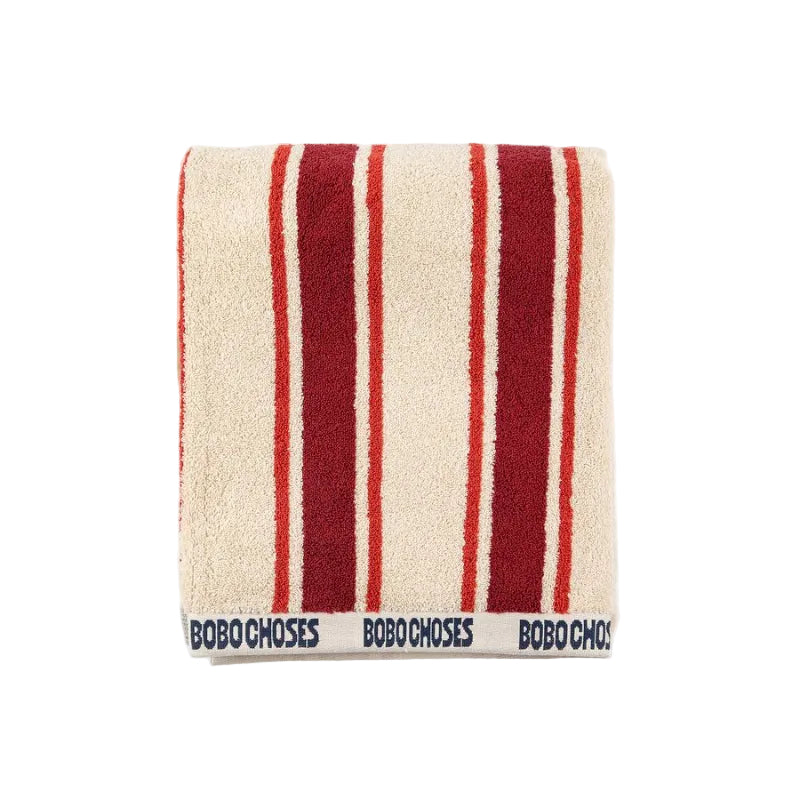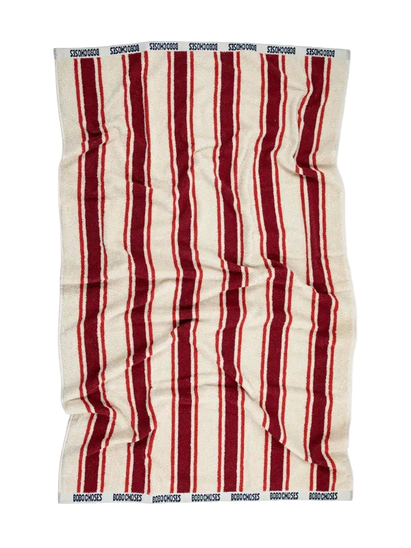 striped beach towel from bobo choses crafted from soft cotton. it features bold red and beige stripes that bring playful energy to your beach days. reinforced edges ensure durability through countless trips to the shore, while the iconic bobo choses branding in black adds a touch of understated style.