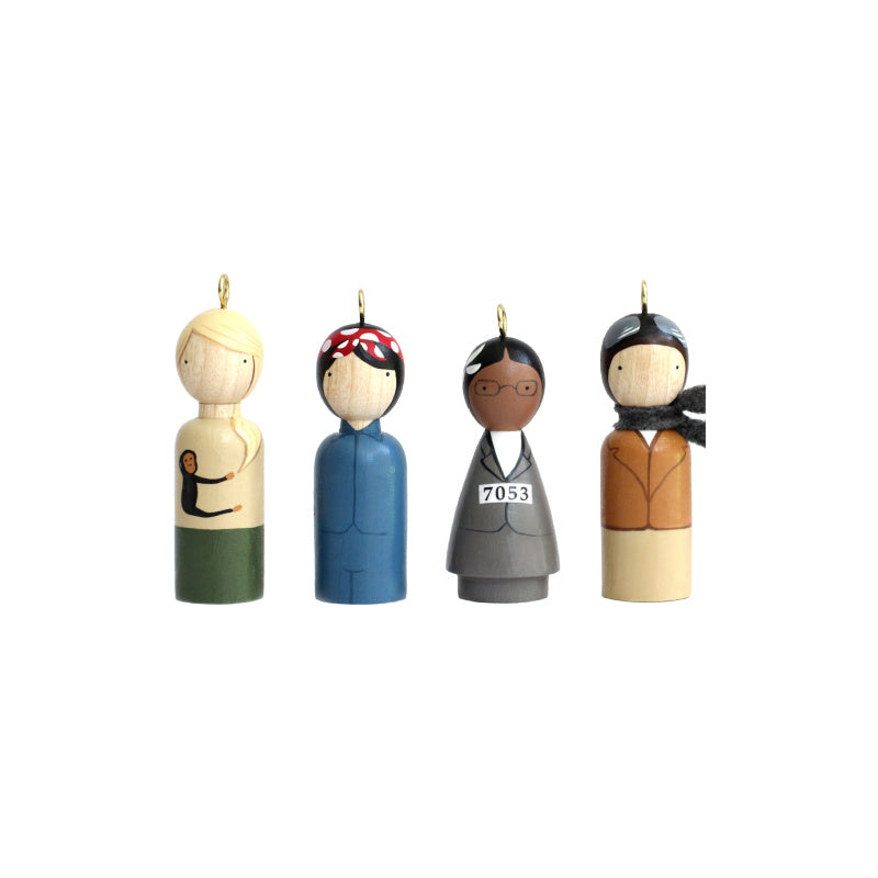 set of 4 wooden ornaments inspired by jane goodall, rosie the riveter, rosa parks, and amelia earhart. these ornaments stand at 3" tall with hook attachments already placed. hand-chiseled from urapán wood on an electric lathe, these classic wooden peg dolls are finished with USA-made non-toxic water-based paints. each doll is unique and safe for little hands. each doll is carefully hand-drawn and hand-painted from start to finish. this is a limited edition product.