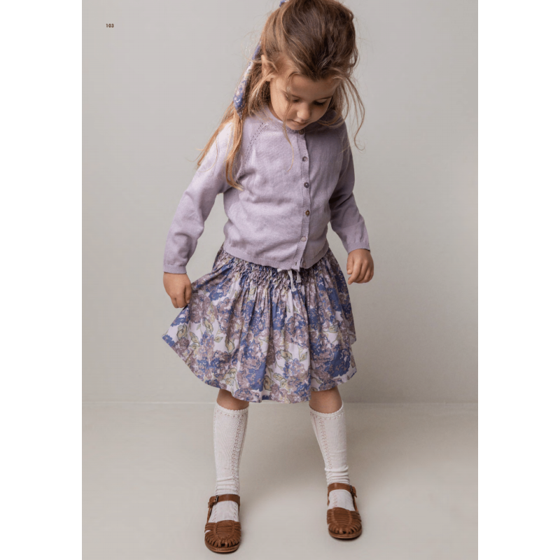 marmar copenhagen sille skirt purple hydrangea print. designed with smocking at the waist and a below the knee lenght.