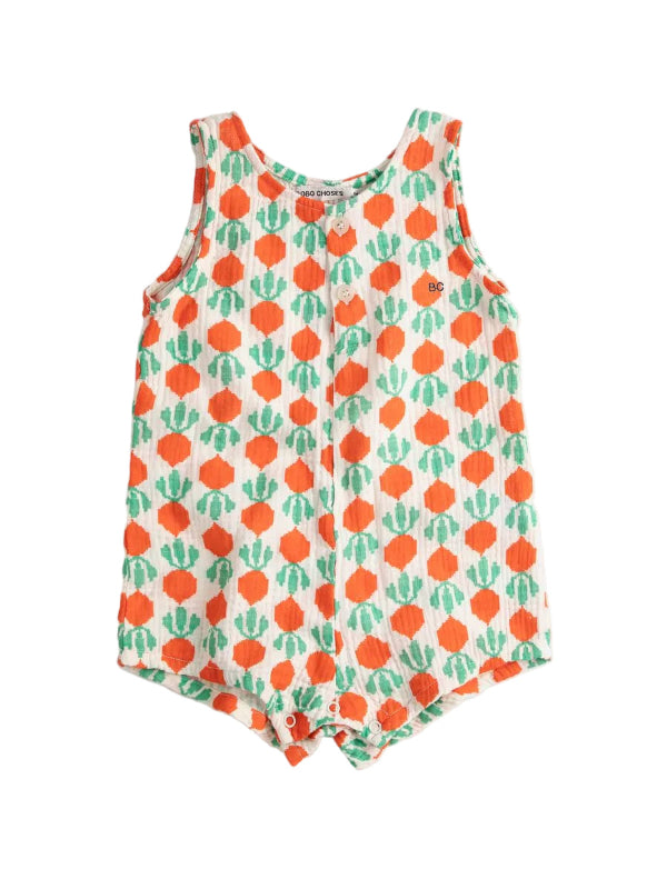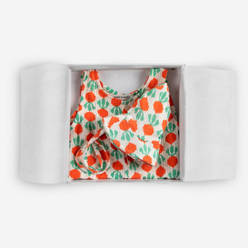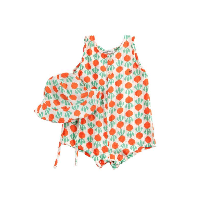 introducing the perfect gift for little ones— the bobo choses cool radish all over baby set. crafted from soft organic cotton, this gender-neutral set features a charming short romper in off-white with an all-over radish print, complete with chest buttons and convenient snap closures at the inner legs. paired with a matching sun hat, it's everything you need for warm-weather adventures. beautifully presented in a bobo choses gift box, it's ready to give straight from the package.
