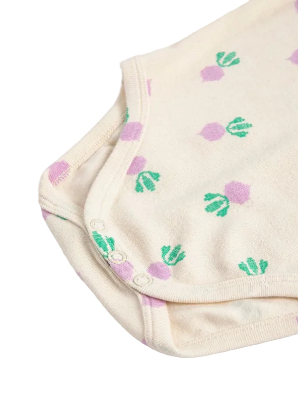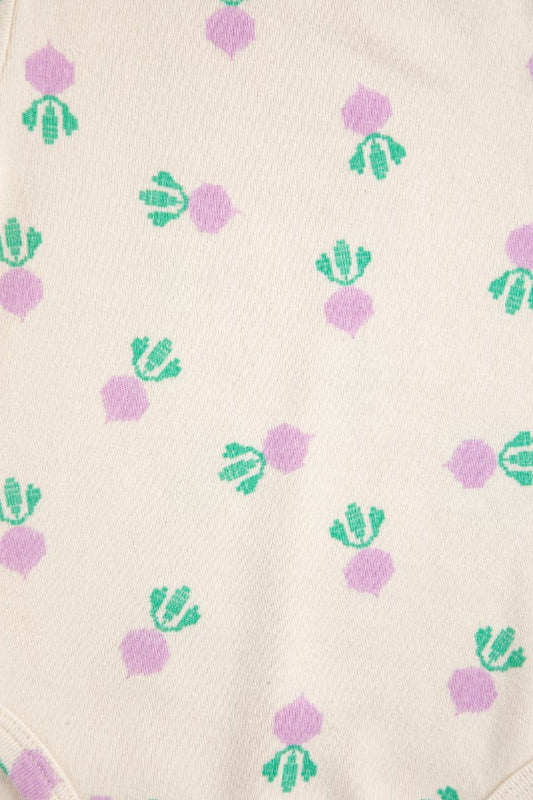 soft organic cotton meets playful farm charm in this adorable bobo choses baby onesie. featuring an all over sugar beet print on a white backdrop, practical envelope shoulders, snaps on the inner leg, and short sleeves.
