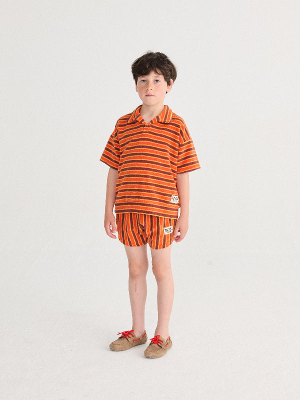 soft terry cloth bobo choses shorts in warm orange, brick, and yellow stripes. the elastic waist ensures a secure, easy fit for active play, while the signature bobo choses patch on the leg adds a playful designer touch.