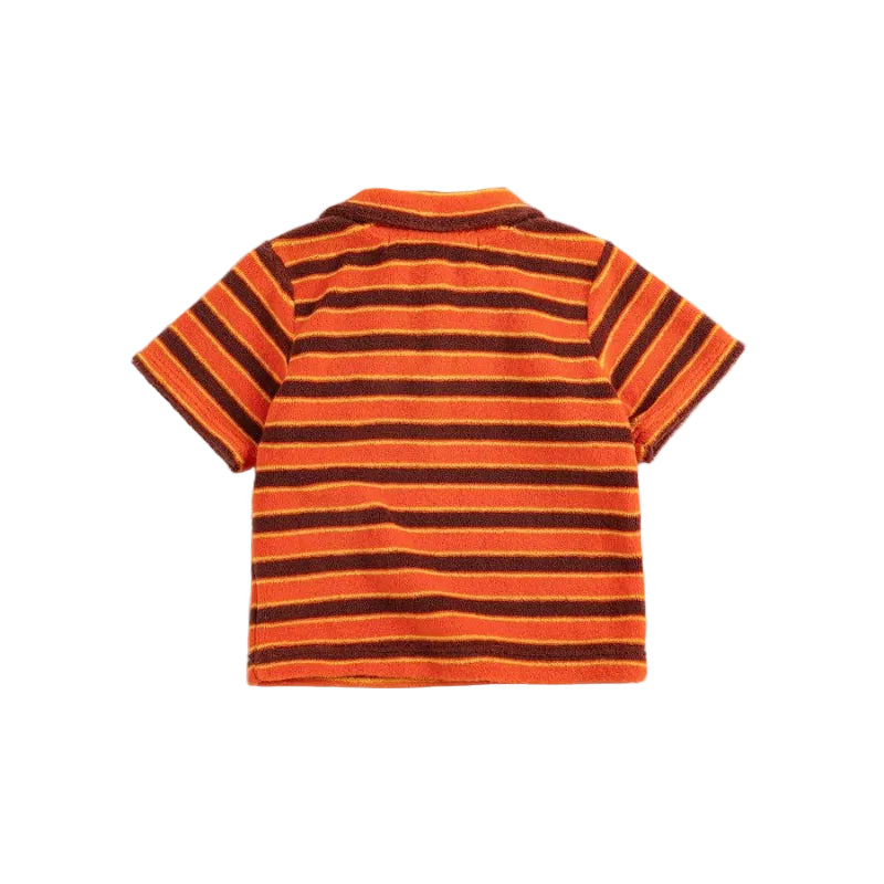 bobo choses striped baby polo featuring bold orange, yellow, and brick stripes with a classic collar and short sleeves. the signature bobo patch on the hem adds a playful finishing touch.