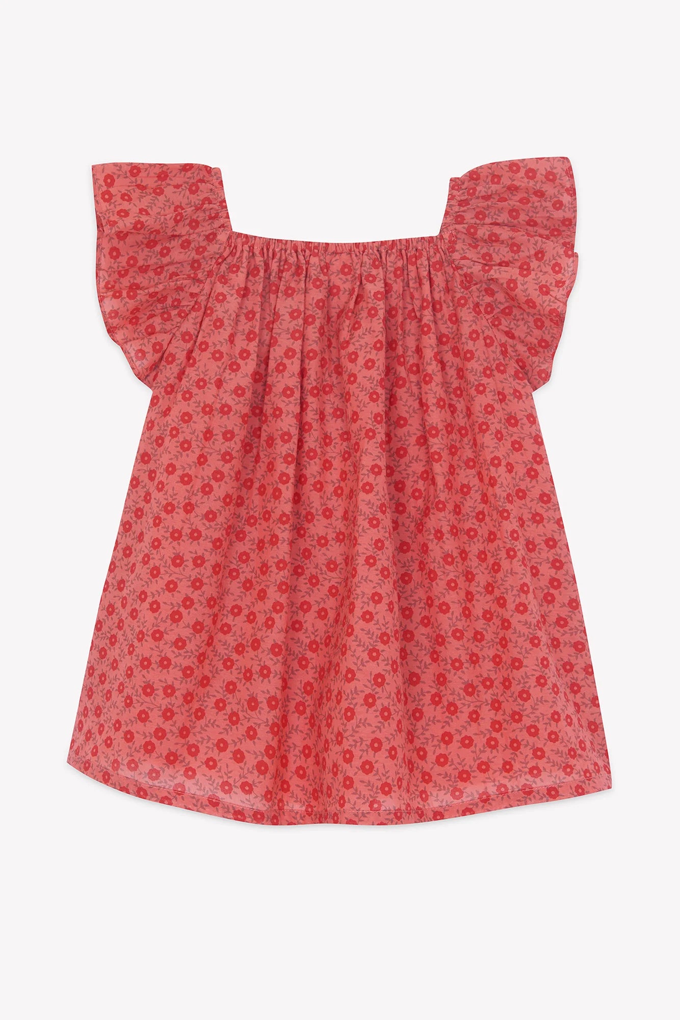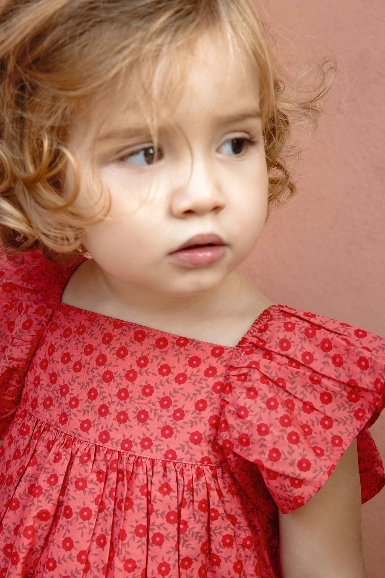 adorable bonton cotton dress featuring a vibrant red base with a tonal floral print throughout. the empire waist creates a flattering silhouette while ruffled sleeves add playful charm. square neckline and elastic shoulders ensure a comfortable, secure fit for little ones.