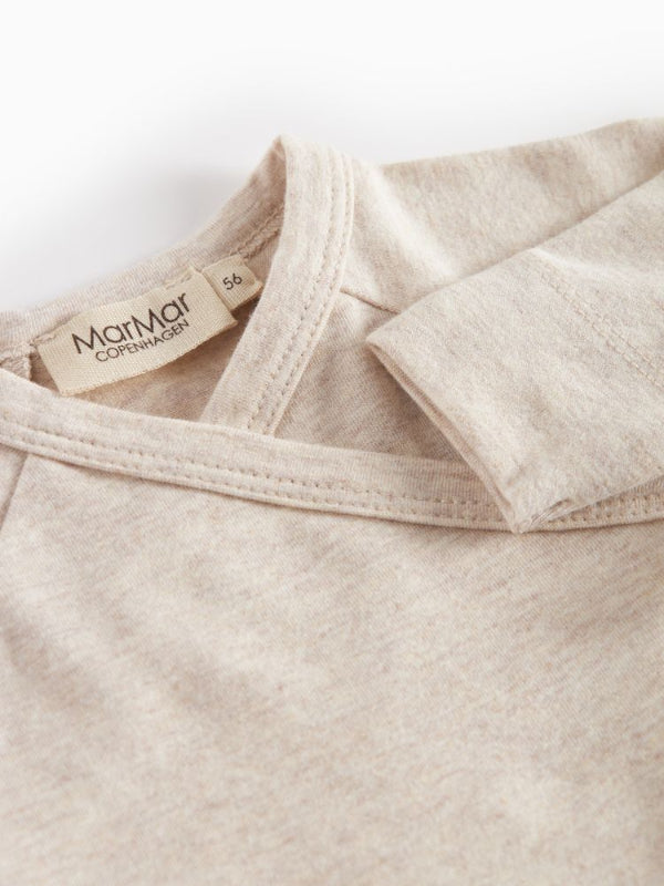 wrap your little one in comfort with this modal organic cotton blend bodysuit from marmar copenhagen. featuring long sleeves and a light beige melange tone, the belita wrap design makes dressing effortless with convenient push snaps between the legs and a ribbon tie closure.
