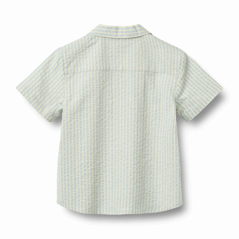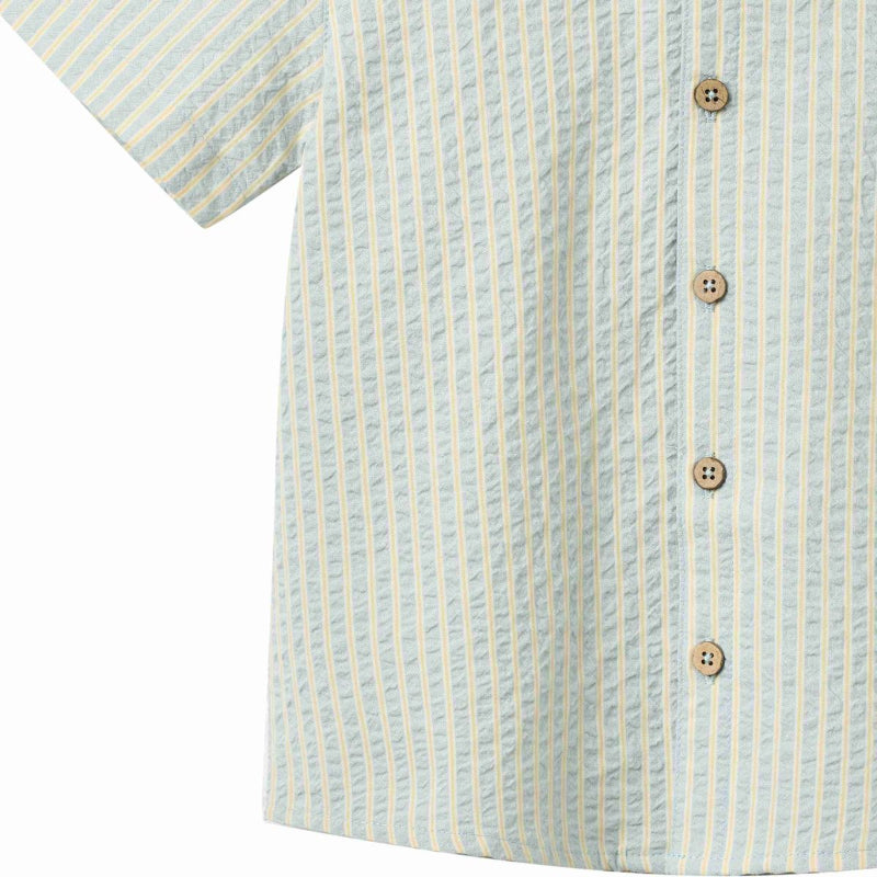 wheat seersucker button-up shirt featuring a relaxed camp collar and light blue and cream stripes. the structured back yoke adds subtle definition while the breathable fabric keeps you cool and comfortable all season long.