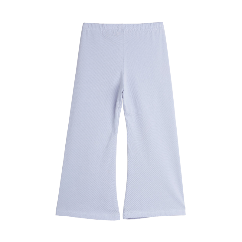 mini rodini birds single print flared trousers in purple. these soft cotton pants have a wide, slightly flared leg with a blackbird near the hem and a stretchy, elastic waistband.