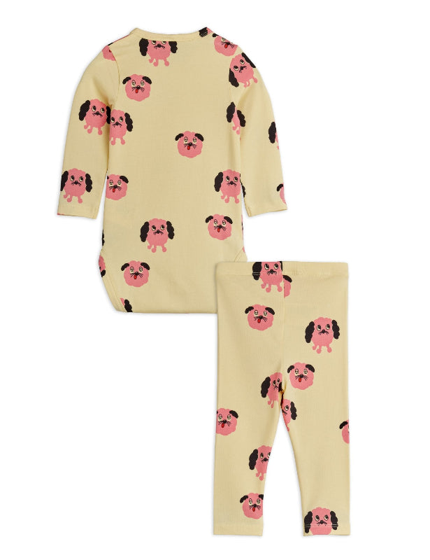 this mini rodini baby set in yellow features a cozy long sleeve bodysuit with snap button closures for easy dressing, all adorned with an all over pink doggies print. the matching leggings include an elastic waistband to keep your little one comfortable all day.