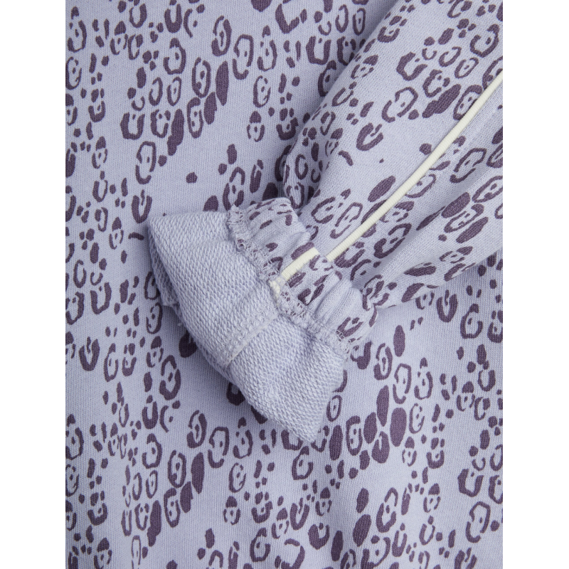 mini rodini mini leopard all over print sweatshirt in purple. this soft leopard print sweatshirt is a pretty purple color with white piping down the sleeve. it features a ribbed neckline and soft elasticated wrists and hemline for a comfortable fit.