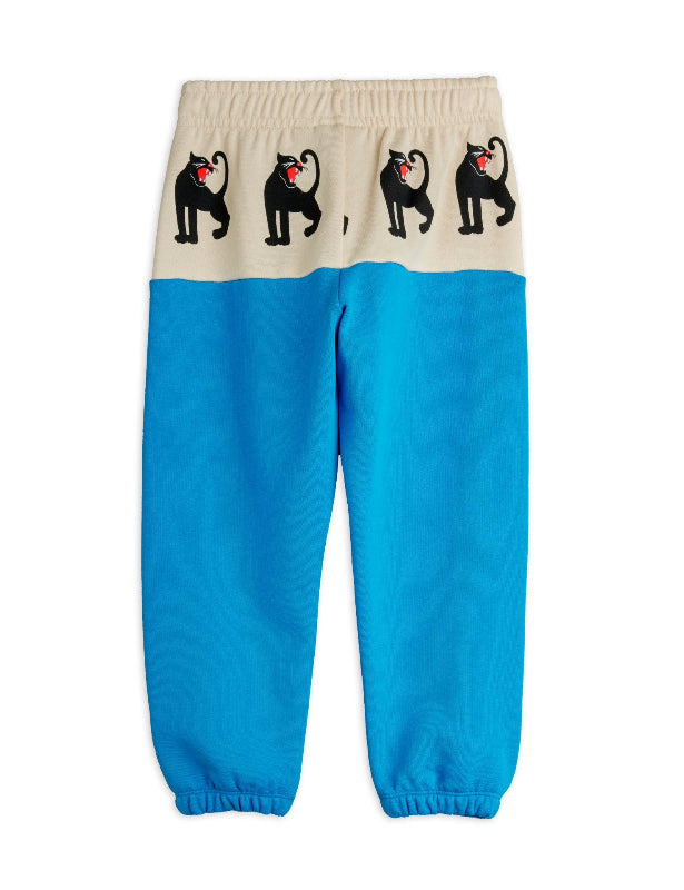 these blue sweatpants from mini rodini feature a playful panel at the waist with panther graphics. designed with an adjustable elastic waist and ankles, they ensure a comfortable and snug fit.