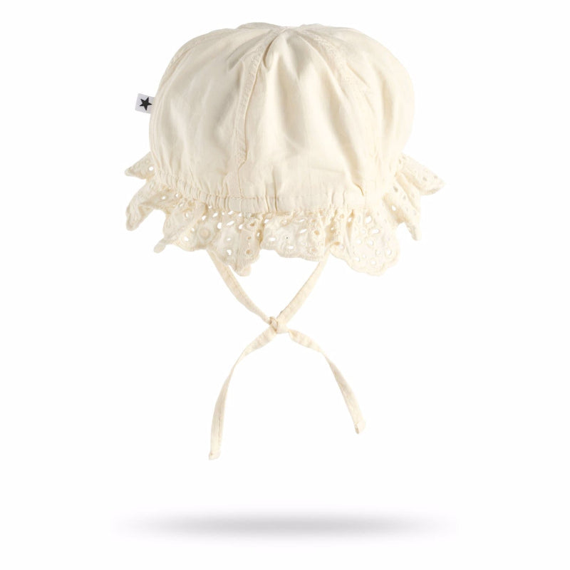 molo noel organic cotton baby sun hat. crafted from 100% GOTS certified organic cotton, it features a gathered brim with eyelet details and adjustable chin ties for a secure fit. the soft pearled ivory tone complements any outfit.