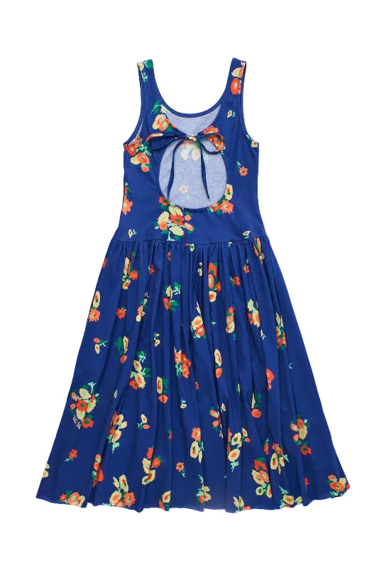 maison mangostan organic cotton dress in blue featuring a vibrant floral print. designed with a fitted bodice with thin shoulder straps and a full gathered skirt that flows beautifully with every step. features a playful peek-a-boo back with tie details, this dress is perfect for warm weather adventures, garden parties, or casual outings where comfort meets style.