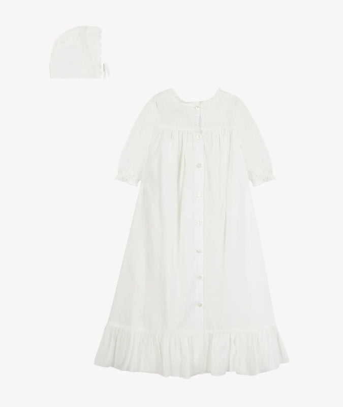 celebrate your little one's special day in this elegant baptism gown from tartine et chocolat. crafted from soft, delicate fabric in timeless white, this dress features charming lace details and airy ruffles that add a touch of refined sophistication. the included matching bonnet completes the look with graceful finishes, making it the perfect choice for a memorable christening. your baby will look absolutely precious in this heirloom-worthy outfit.