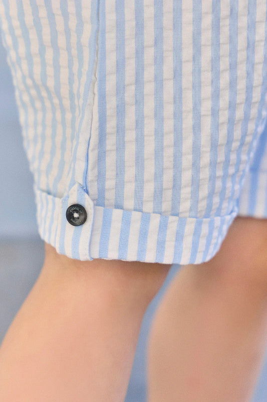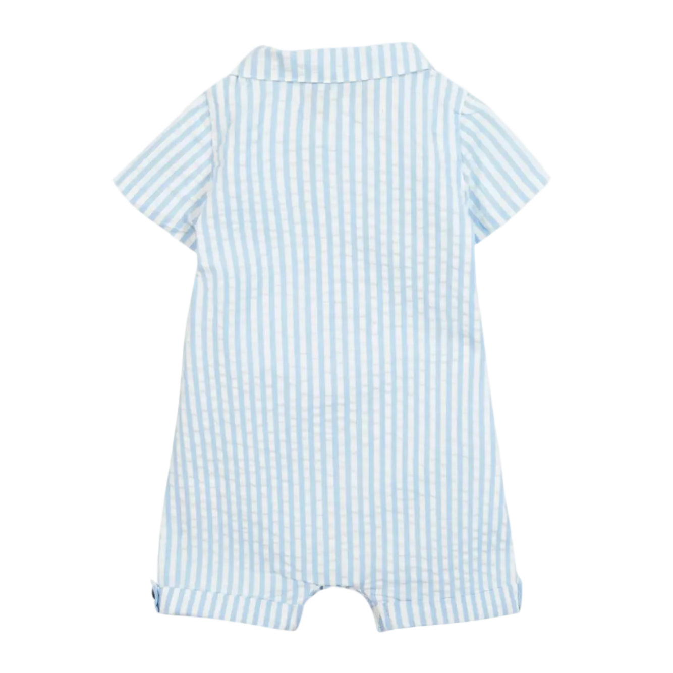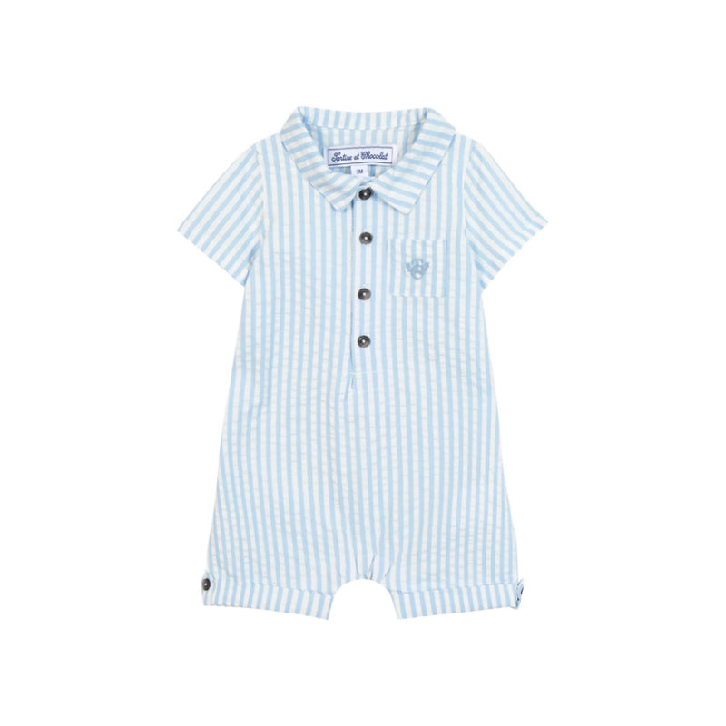tartine et chocolat seersucker baby jumpsuit in blue and white stripes. the pointed collar and signature pocket add a polished touch, while the practical front button placket and inner leg snaps makes diaper changes and dressing a breeze.