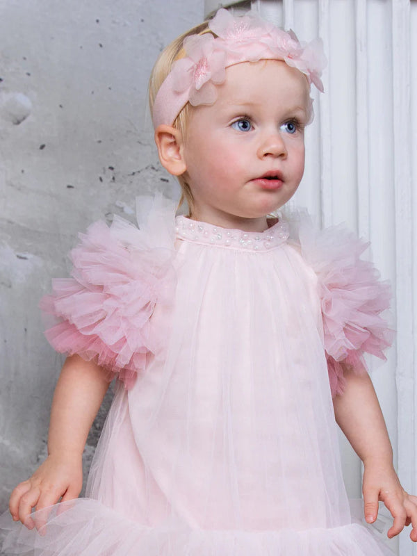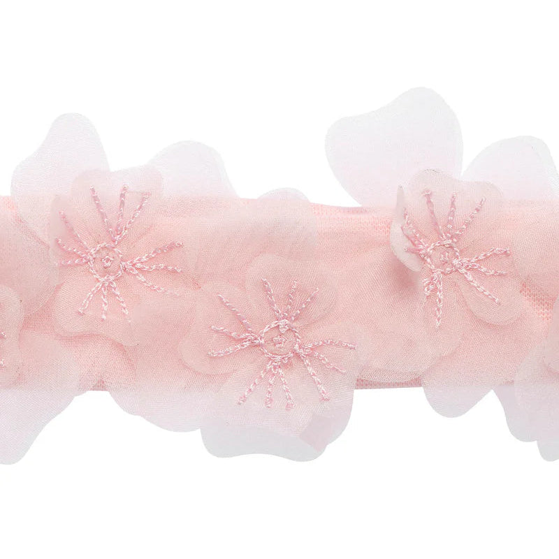 tutu du monde bébé althea headband in pink is a sweet finishing touch for little dreamers. crafted from soft cotton jersey for comfort, it is adorned with delicate tulle flowers across the band, adding a whimsical flourish to every outfit.