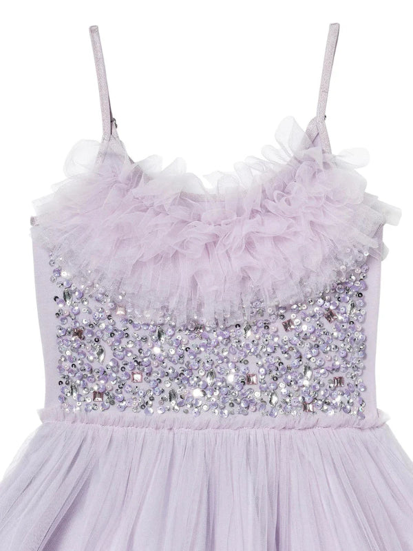tutu du monde celestial shine tutu dress in pastel lilac. a fully sequined bodice adds a bold, radiant sparkle, while the soft tulle skirt in gentle lilac tones gives it that signature petunia float. with a double ruffle hem for extra movement, this dress is light, luxe, and made for memory-making on long, sunny days.