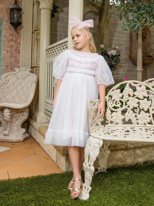 tutu du monde radiant and refined opaline tulle dress in tiara sparkles with starlit majesty. billowing layers of tulle and puffed sleeves shape a celestial silhouette, while the gem-strewn bodice glows beneath sheer tulle. rows of jewels ascend to the neckline, mirroring constellations scattered across the heavens.
