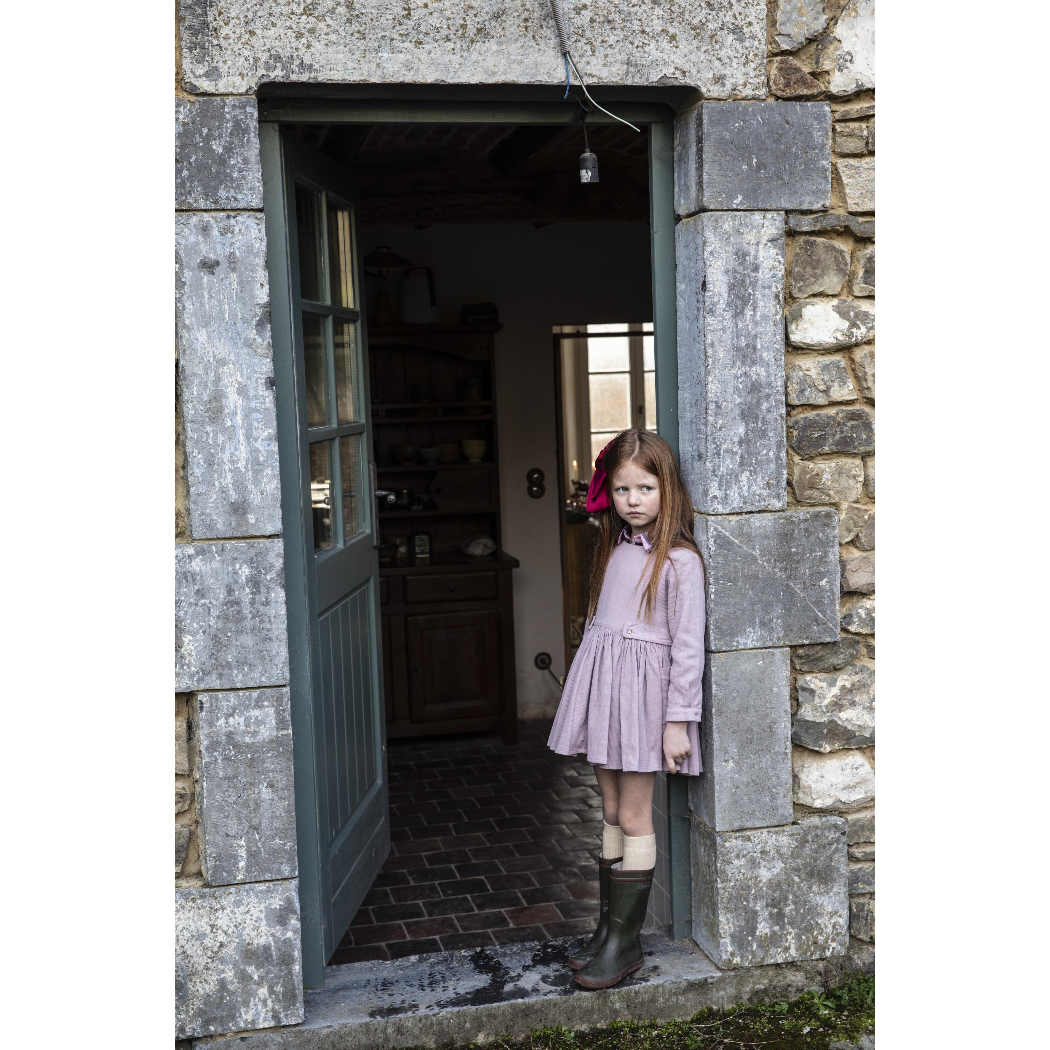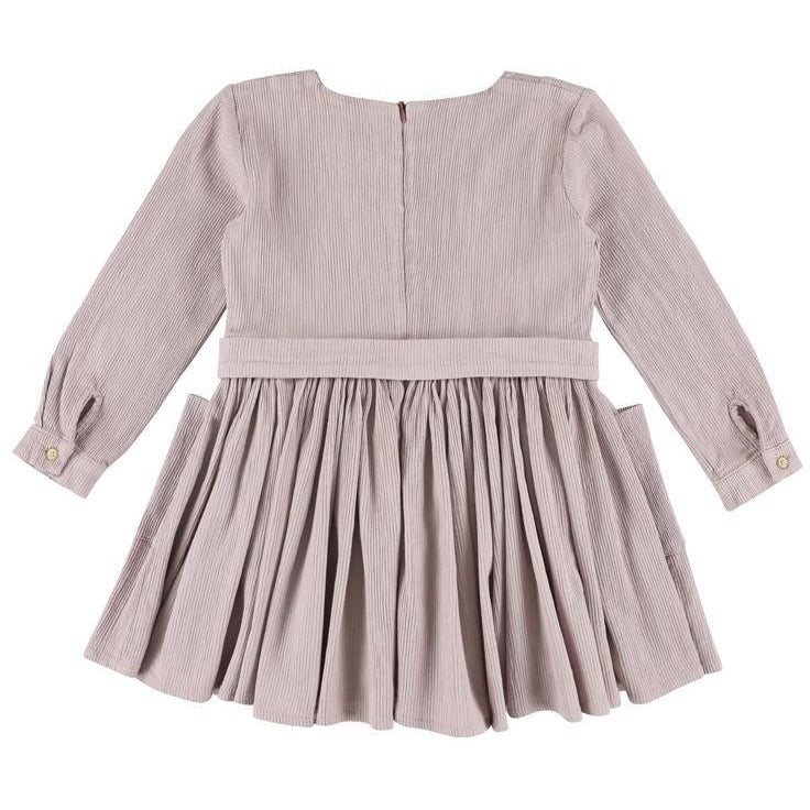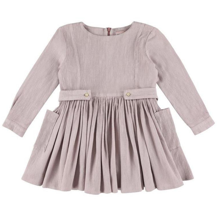 morley emil dress with corduroy-like fabric, a flouncy skirt, deep pockets and a stylish button waistband. fully lined with zipper closure in back.