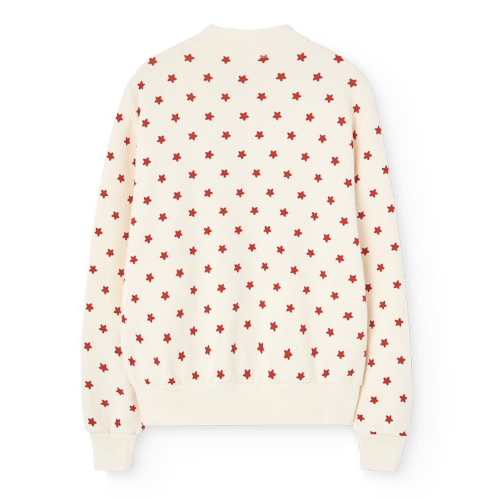the animals observatory track jacket crafted from 100% cotton in crisp white with playful red stars all over print. the ribbed edges provide a snug, comfortable fit, while the convenient kangaroo pocket keeps essentials close.