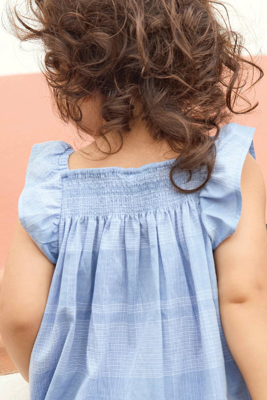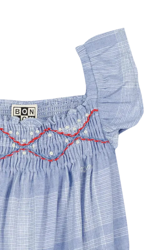 bonton blue check jumpsuit featuring delicate ruffled sleeves and intricate hand-embroidered white rosettes paired with a red crisscross smocking detail, it's as sweet as it is stylish. practical snap closures between the legs make diaper changes a breeze.