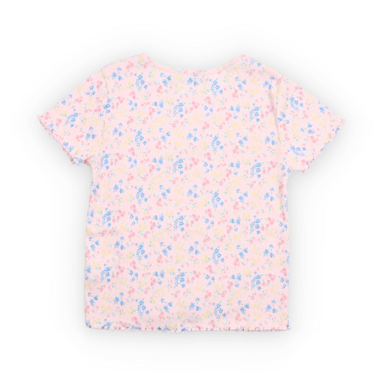 the new society soft pink ribbed tee with an all-over floral print and a round neckline featuring a charming small ribbon detail. short sleeves with lettuce edging add a feminine touch to the hem and cuffs.