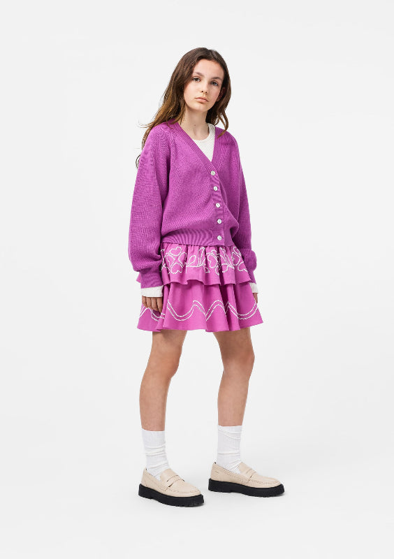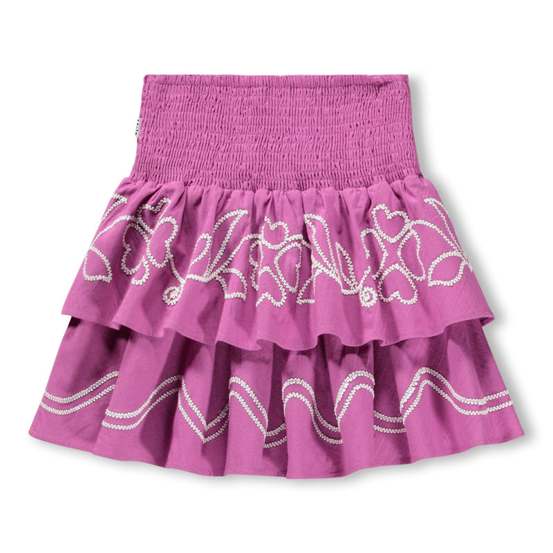 the molo bonita skirt in charisma is a charming layered mini skirt crafted from soft organic cotton. featuring a comfortable wide elastic waist for easy movement and an elegant white embroidery design that adds a delicate touch, this skirt is perfect for everyday wear. the layered silhouette creates beautiful dimension and movement, making it an ideal choice for active kids who want style and comfort combined.