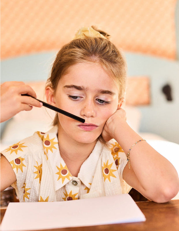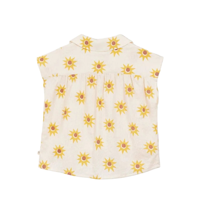 arsene & les pipelettes cheerful sun print blouse crafted from breathable 100% cotton seersucker. it features a classic shirt collar and front button opening for easy wear. details include gathered seams at the front and back for a flattering silhouette, a functional chest patch pocket, and a signature flag label at the side seam.