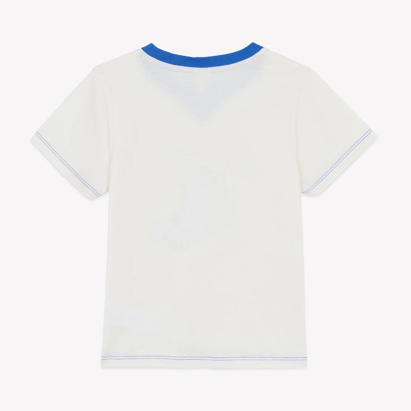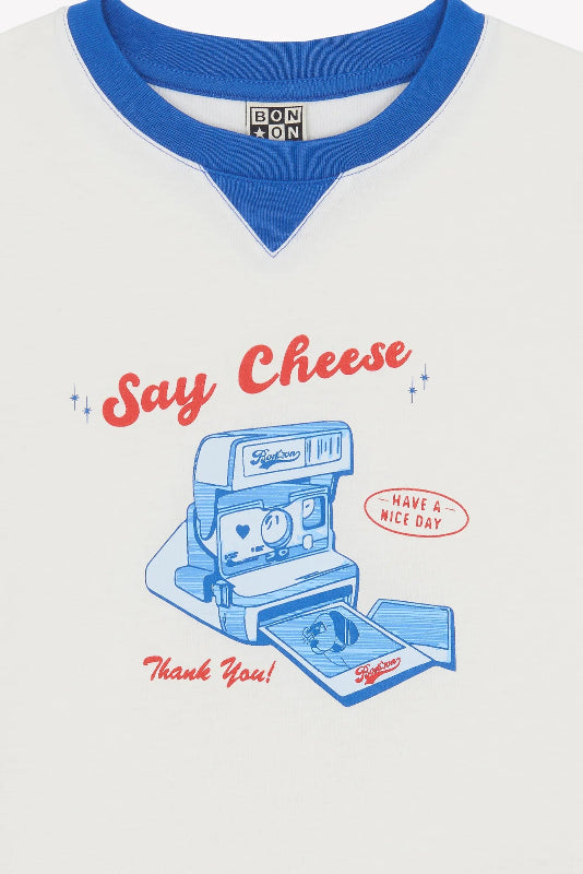 capture the moment in this bonton lodeste tee. crafted from soft off-white cotton, it features a classic crew neck with contrasting blue ribbing and topstitching on the sleeves and hem. the front showcases a playful polaroid camera graphic with "say cheese" text—perfect for little ones who love vintage vibes and fun details.