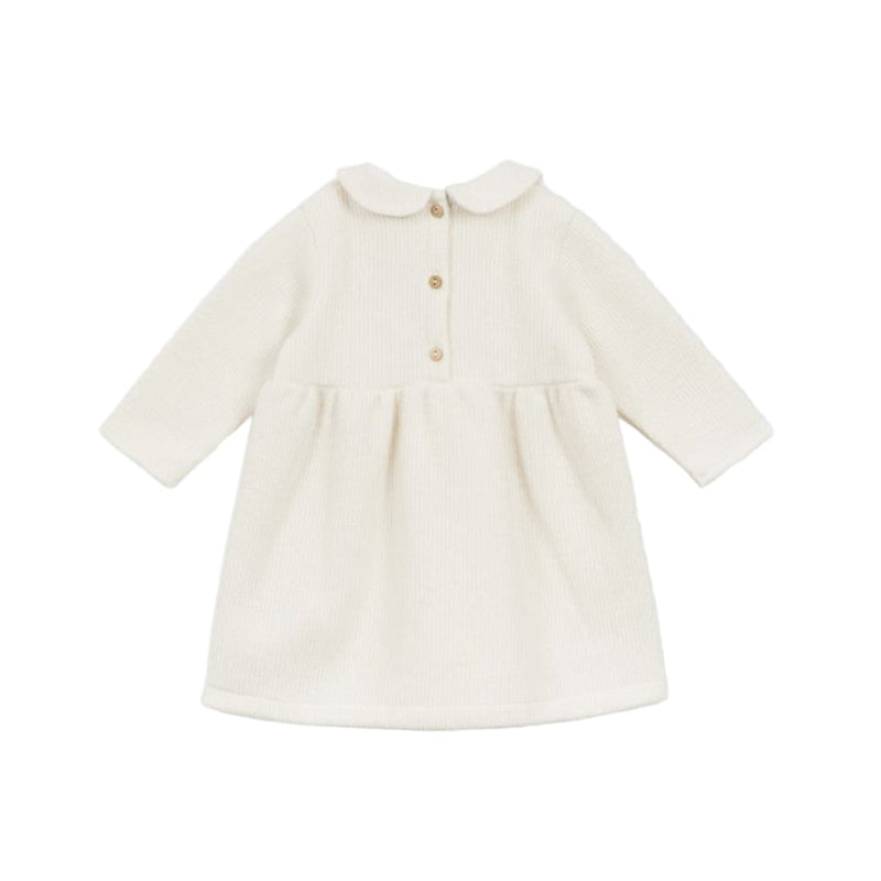 arsene & les pipelettes baby dress made of soft organic cotton ribbed knit fabric for comfort. it has a flared shape and long sleeves, perfect for keeping your little one cozy. the rounded neckline is accented with a charming peter pan collar, while subtle pleats on the front and back add gentle texture. wooden buttons at the back make dressing easy.