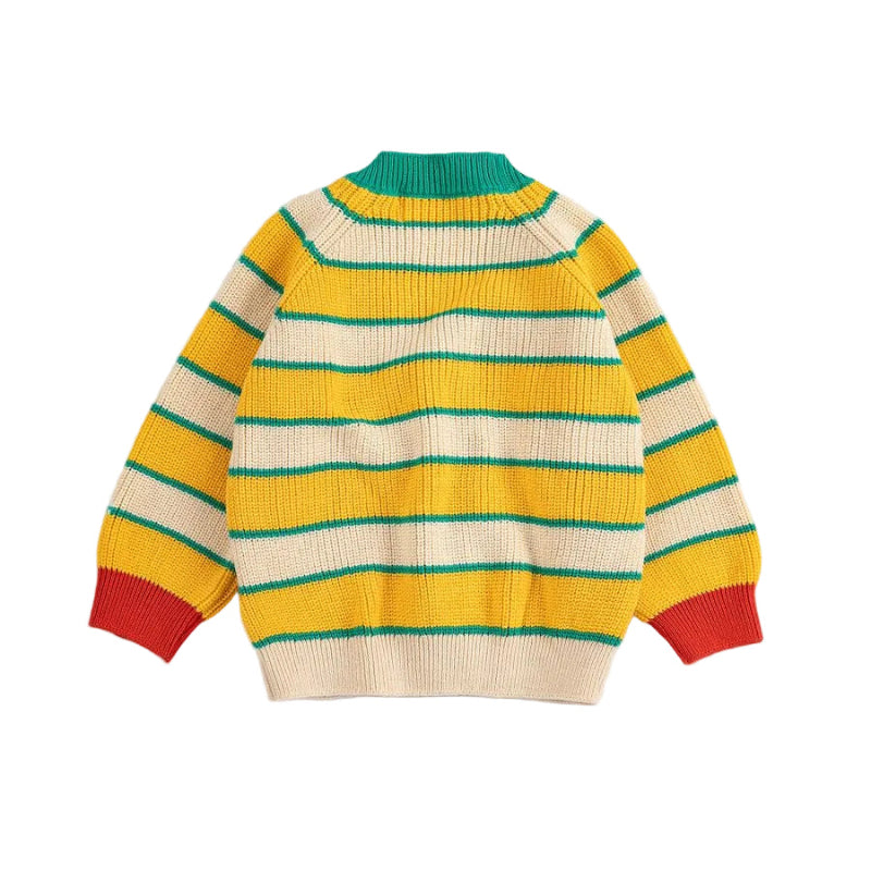 soft organic cotton meets playful style in this bobo choses baby cardigan. featuring cheerful yellow cream and green stripes with a classic v-neck, it's finished with contrast green ribbed trim and red ribbed wrists.