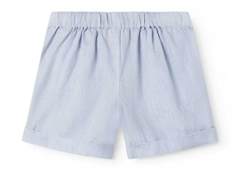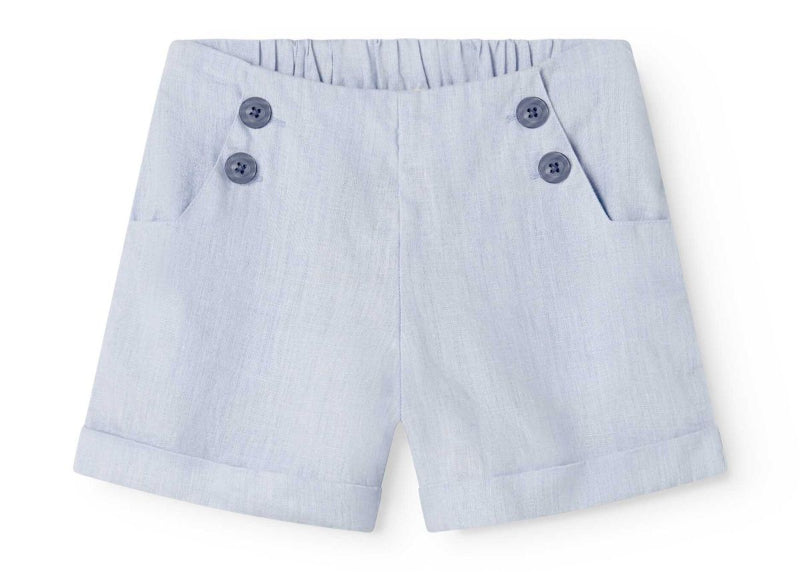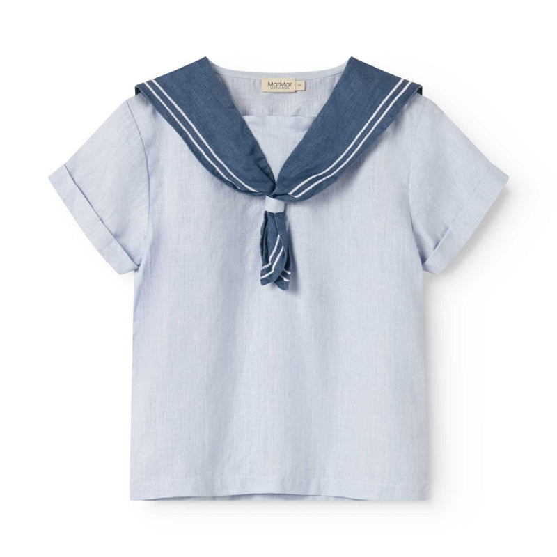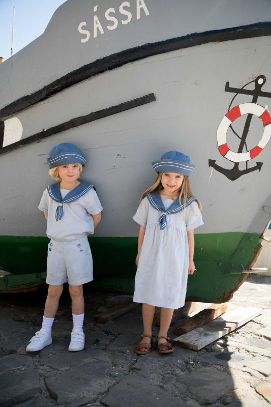this charming nautical set combines comfort and style in 100% breathable linen. the light blue shirt features short sleeves and a navy sailor collar with white embroidered trim, while coordinating pants offer a flat front waist with gathered elastic back, decorative buttons, and functional pockets. an effortless ensemble perfect for warm days and seaside adventures.
