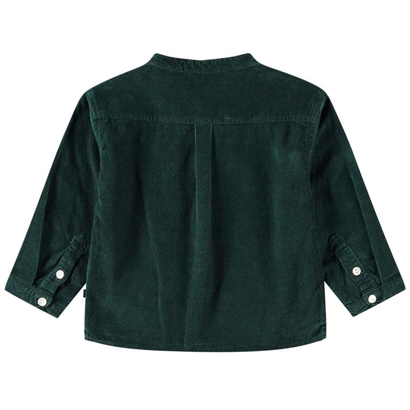molo enoz dark green shirt in organic cotton for the little ones. the shirt is made of soft ribbed baby corduroy and has a mandarin collar and a button placket with three white buttons. it has a loose fit, making it comfortable to wear and easy to put on.